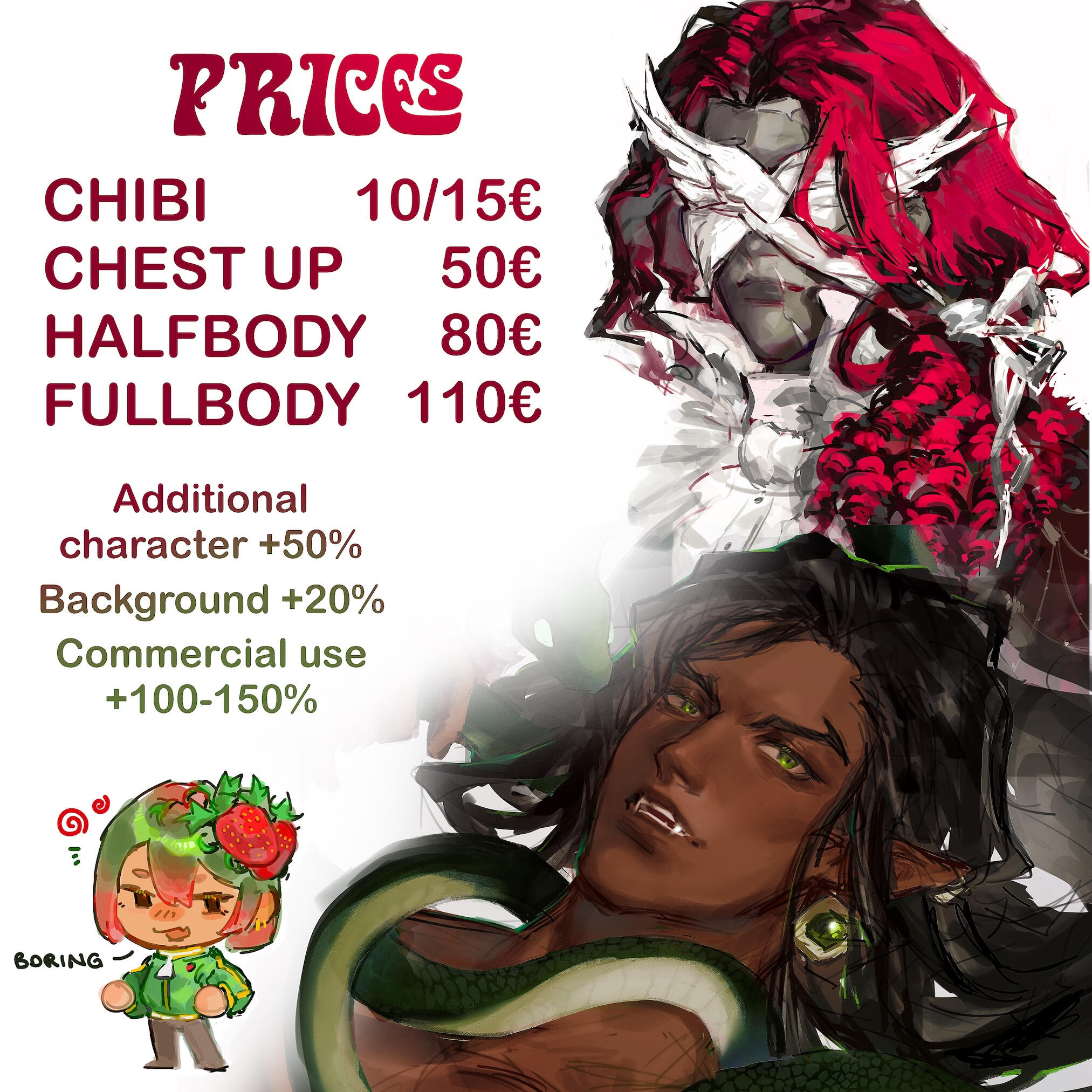 These commission prices are for personal use. For commercial use, the price increases by 100–150%, depending on your needs.